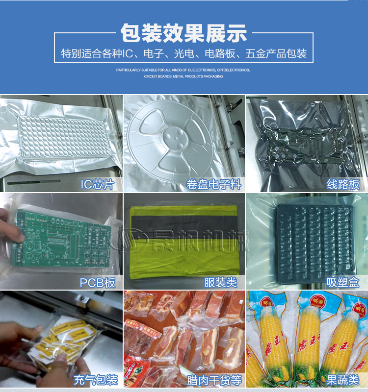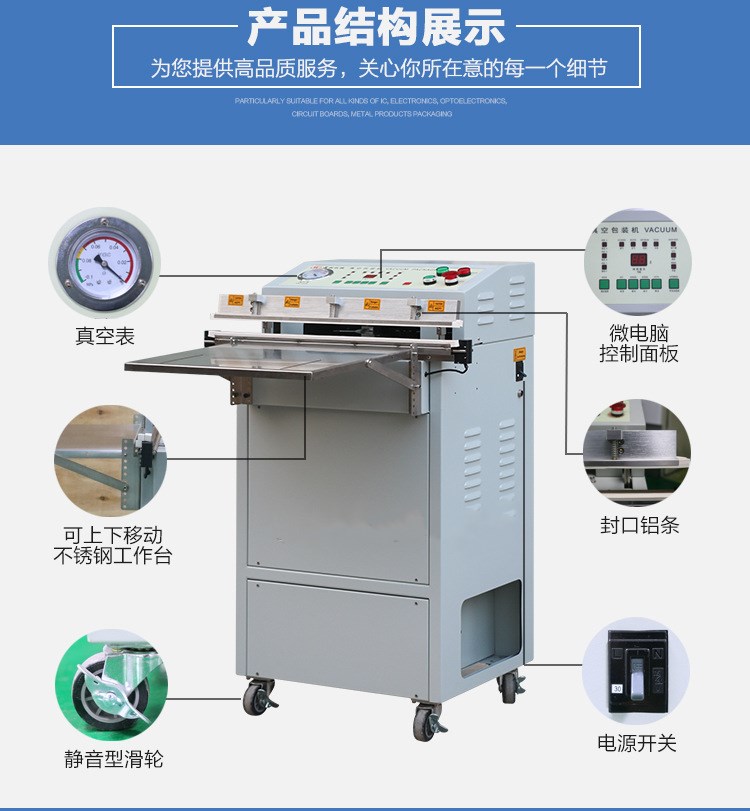 這款外抽式真空機(jī)廣泛適用于電子產(chǎn)品,如晶片、半導(dǎo)體、IC、金屬加工件的防潮、防氧化變色等,布料、棉羊毛制品等,進(jìn)行真空包裝、降低包裝體積,保持原味、新鮮、并可防沖擊。